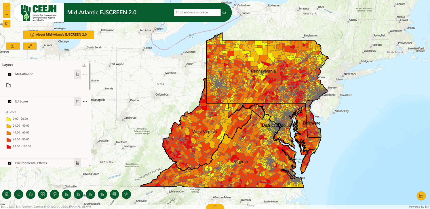 Developed by CEEJH INC, Mid-Atlantic EJSCREEN 2.0 is a mapping tool that employs a multi-indicator analysis to assess cumulative impacts for neighborhoods throughout Delaware, Maryland, Pennsylvania, Virginia, West Virginia, and Washington D.C.